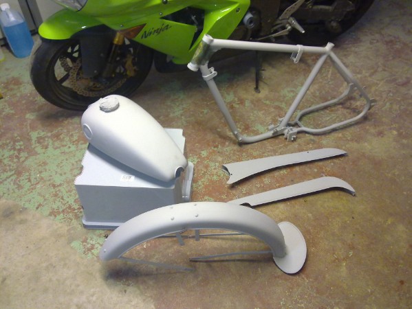 Quelques pièces de retour du sablage repeintes d'un primer epoxy.